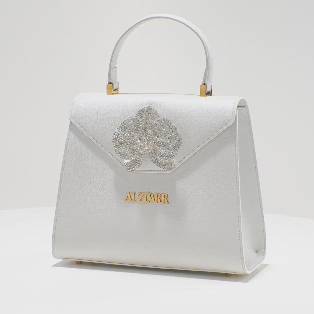 Timeless and chic, the Gyall bag has that timeless design, where it still has an eye-catching effect through the signature light-catching orchid that is placed at the opening. The Orchid is inspired by the mother of designer Zeynep Dag and has Crystals on them. The bag is crafted from white Nappa leather and has gold hardware with the Alzúarr logo for that extra detail. The Gyall is the perfect accessory for every occasion.