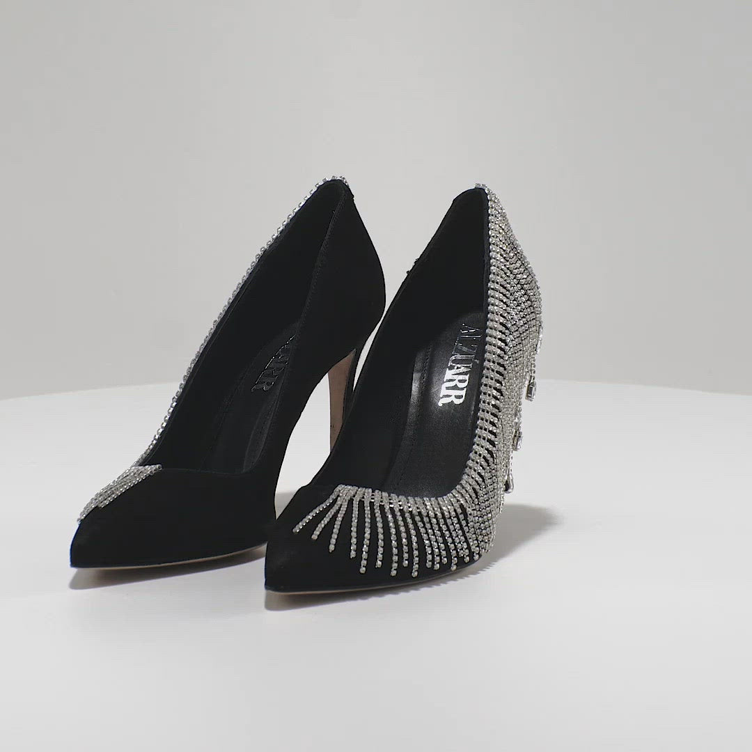 In soft black suede, The Merci is the sophisticated pump that will blow everyone away. The pair is detailed with a string of 1038 light-catching crystals that are added on both outer sides and will definitely spark your movement. For a stylish look, the shoe is shaped with a pointed toe that complements the 100mm heel wonderfully. Wear your outfit with these heels and you are sure to make a great impression. The Merci shoe is handmade in Italy from the finest suede.